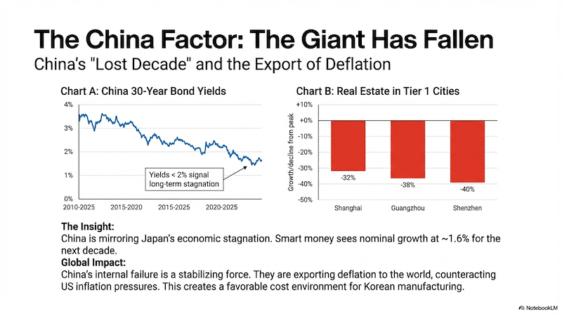 While a strong U.S. economy creates inflationary pressure, China’s concurrent economic collapse provides a critical deflationary counterweight, creating a “Goldilocks” environment for Korean assets. China’s severe decline and deflation help moderate global inflation, making the “Rapid Inflation -> Crash” scenario far less likely for now. The evidence of this collapse is undeniable: